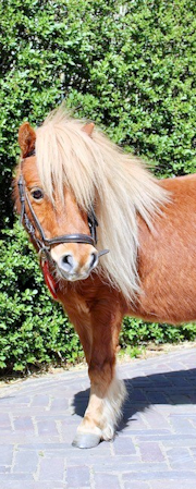Een vos ruin geboren in 2010. Flip is een mini shetlander van 88cm. Flip is onze 'knuffelpony' en woont met Olaf samen in hun eigen paddock met huisje. Flip loopt voor de sulky en kan kinderen de beginselen van het mennen leren. Ook met de hele kleinste loopt hij super braaf over het terrein om ze kennis te laten maken met een pony. Flip houd van aandacht en draait zijn hoef niet om voor een lekkere poetsbeurt